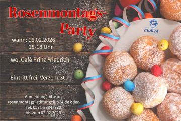 Am 16. Februar lädt die Stiftung Club 74 herzlich zur Rosenmontagsparty ins Café Prinz Friedrich ein. Von 15 bis 18 Uhr feiern wir gemeinsam einen bunten, fröhlichen Nachmittag mit guter Stimmung und netten Begegnungen. Für eine bessere Planung bitten wir um eine kurze Anmeldung unter: rosenmontag@stiftungclub74.de Wir freuen uns auf einen fröhlichen Rosenmontag!