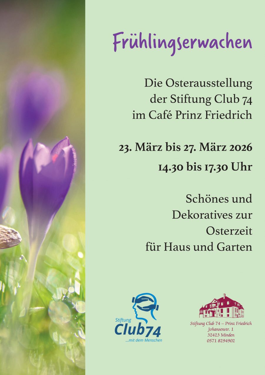 Die Stiftung Club 74 lĂ€dt herzlich zur Osterausstellung ein. Vom 23. bis 27. MĂ€rz 2026 verwandelt sich das CafĂ© Prinz Friedrich in einen Ort voller Farbe, KreativitĂ€t und FrĂŒhlingsfreude. TĂ€glich von 14:30 bis 17:30 Uhr erwarten Sie Kunstwerke und Genussmomente. Wir freuen uns auf Ihren Besuch.