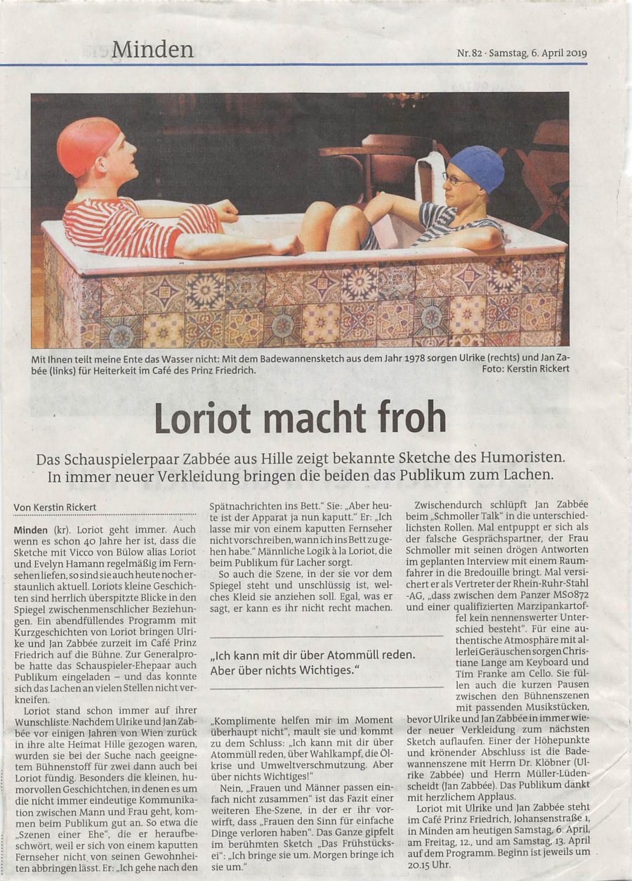 06.04.2019 – Mindener Tageblatt – Loriot macht froh (Copyright: Mindener Tageblatt, 06.04.2019. Texte und Fotos aus dem Mindener Tageblatt sind urheberrechtlich geschützt. Weiterverwendung nur mit schriftlicher Genehmigung der Redaktion – http://www.mt.de)