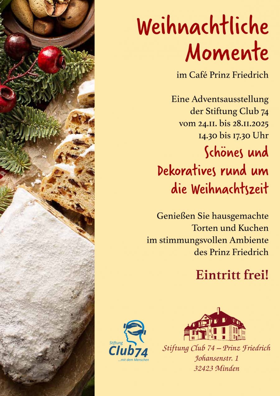 Die Stiftung Club 74 lädt herzlich ein zur Adventsausstellung im Café Prinz Friedrich. Vom 24. bis 28. November 2025 erwartet Sie eine liebevoll gestaltete Auswahl an Schönem und Dekorativem rund um die Weihnachtszeit.